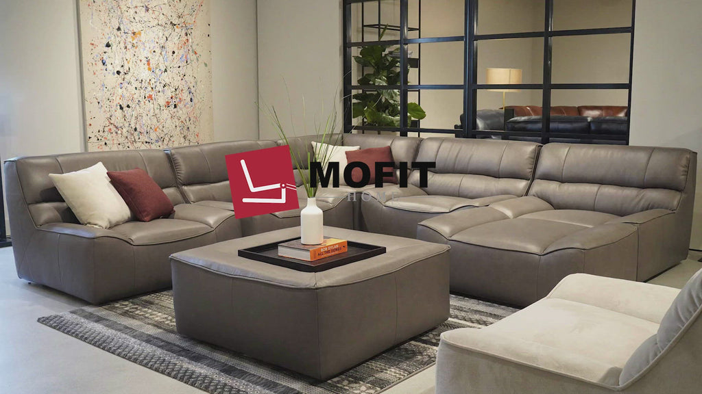 The Anemone Modern Motion Sectional Sofa. This beautifully crafted cloud sectional is a one-of-a-kind modern leather sofa. This u shaped sectional comes with a leather ottoman and an l couch day bed sofa to create the image of a classical u shaped couch. This oversized sectional matches well with the large ottoman, making this mid century modern sectional the perfect sectional with ottoman for any tiny home or large living room.