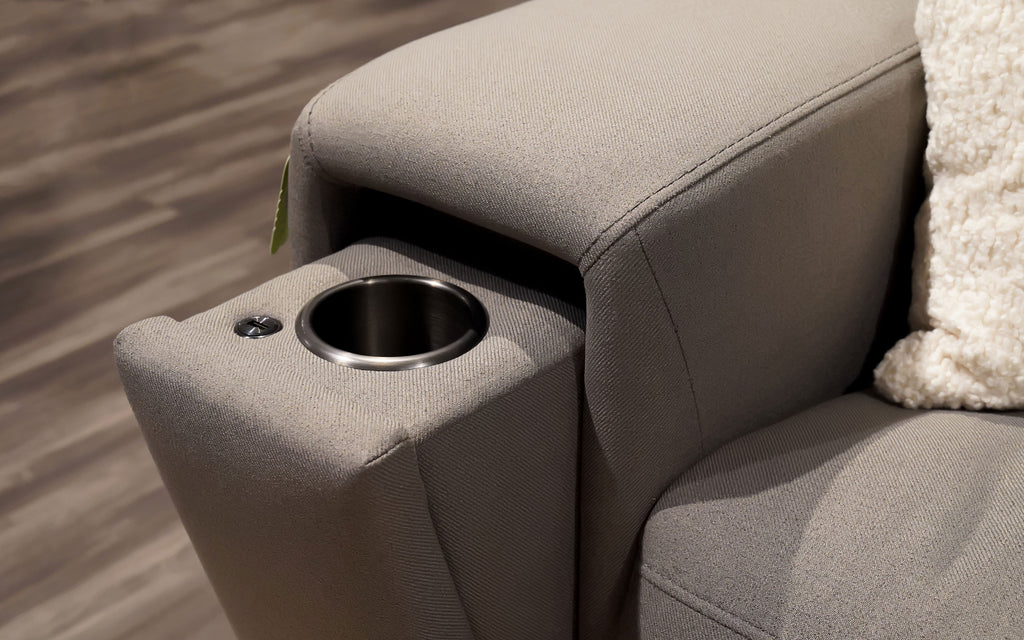 The two-track armrests with a hidden compartment make for a conveniently placed mini modern console table. In each hidden armrest, there is 1 stainless steel cup holder and 1 USB Port that brings about total relaxation. Sink into softness with this one of a kind modern motion recliner. Personalized furniture made by you, for you. Introducing MoFit Home and our Modern Motion Furniture Collection.