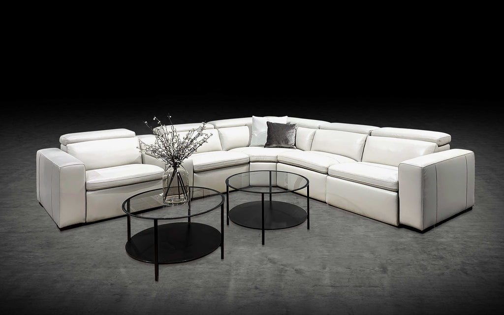The Aquilegia Modern Motion Recliner is made of high-quality Italian leather. This modern styled Sectional with recliner comes with three reclining chairs, an armless chair, a corner piece, and a console table.